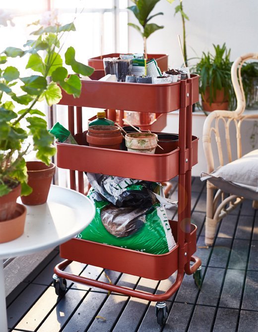 Pilih satu dengan beberapa tingkat dan bahagikan mengikut keperluan, simpan benih yang baru ditanam dan air pada bahagian atas, pasu dan perkakas tambahan di para tengah, dan beg tanah yang berat di bahagian bawah.