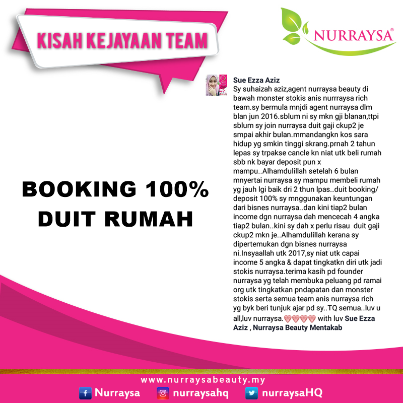 Segala duit booking rumah yang digunakan juga adalah 100% hasil daripada keuntunggannya dalam menjual produk Nurraysa. Dan kejayaan demi kejayaan dikecapi oleh Stokis Sue Ezza ini apabila incomenya tiap bulan sudah mencecah 4 angka dan kini tahun 2017 sudah pun menjadi Stokis Nurraysa.