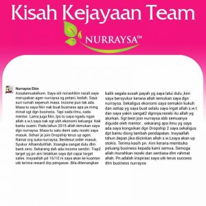 Berkat usahanya juga telah membuatkan ekonomi keluarganya semakin kukuh. Tiada lagi masalah kewangan. Jika sebelum join tak ada ilmu tapi sekarang atas support dan guide daripada mentor Nurraysa beliau sudah tahu tentang selok-belok perniagaan. Sekarang ilmu yang ada, dikongsikan pula kepada dropship di bawahnya sekaligus dapat membantu mereka jana pendapatan.