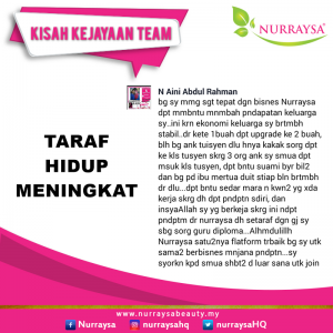 Bukan itu sahaja, hasil join Bisness Nurraysa ni juga beliau telah membantu rakan-rakan dan saudara-maranya yang tiada pekerjaan atau pendapatan sebelum ni bersama-sama join Team Nurraysa dan kini mereka semua dah ada pendapatan sendiri.