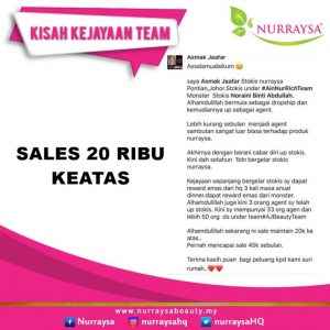 Alhamdulillah, dah ramai yang berjaya apabila bersama Team Nurraysa. Salah seorangnya Stokis Asmak Jaafar ini.Bermula sebagai dropship tanpa modal dan kemudiannya dengan keyakinan dan usahanya dalam perniagaan ini beliau telah upgrade sebagai Agent pula. Selepas sebulan, beliau telah nampak sambutan yang luar biasa terhadap produk Nurraysa. Akhirnya dengan kemahuan dan matlamat yang ada, beliau cabar diri beliau sendiri up sebagai Stokis sehinggalah ke hari ini.