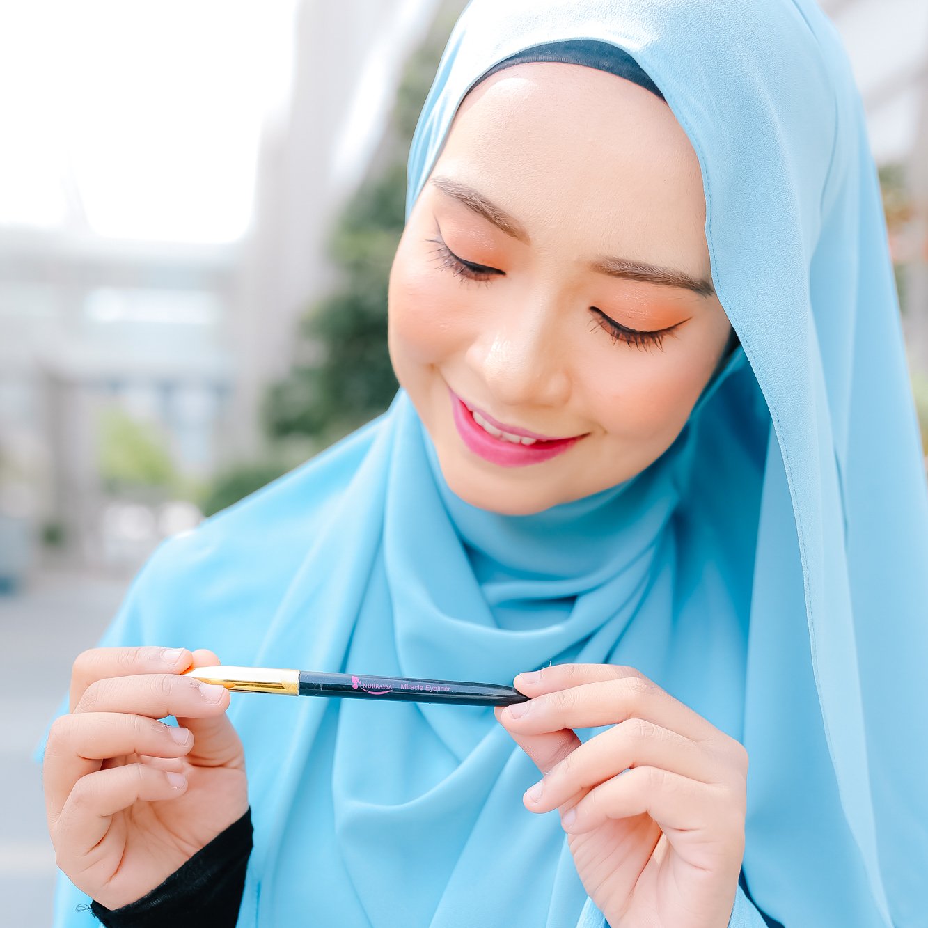 Lukis bentuk kening menggunakan Nurraysa Perfect Brow Shaping. Letakkan eyebrow di kawasan yang dilukis tadi. Ratakan kening dengan berus. Boleh gunakan Glowing DD Moist Cake sebagai concealer untuk tutupkan kening yang berlebihan.