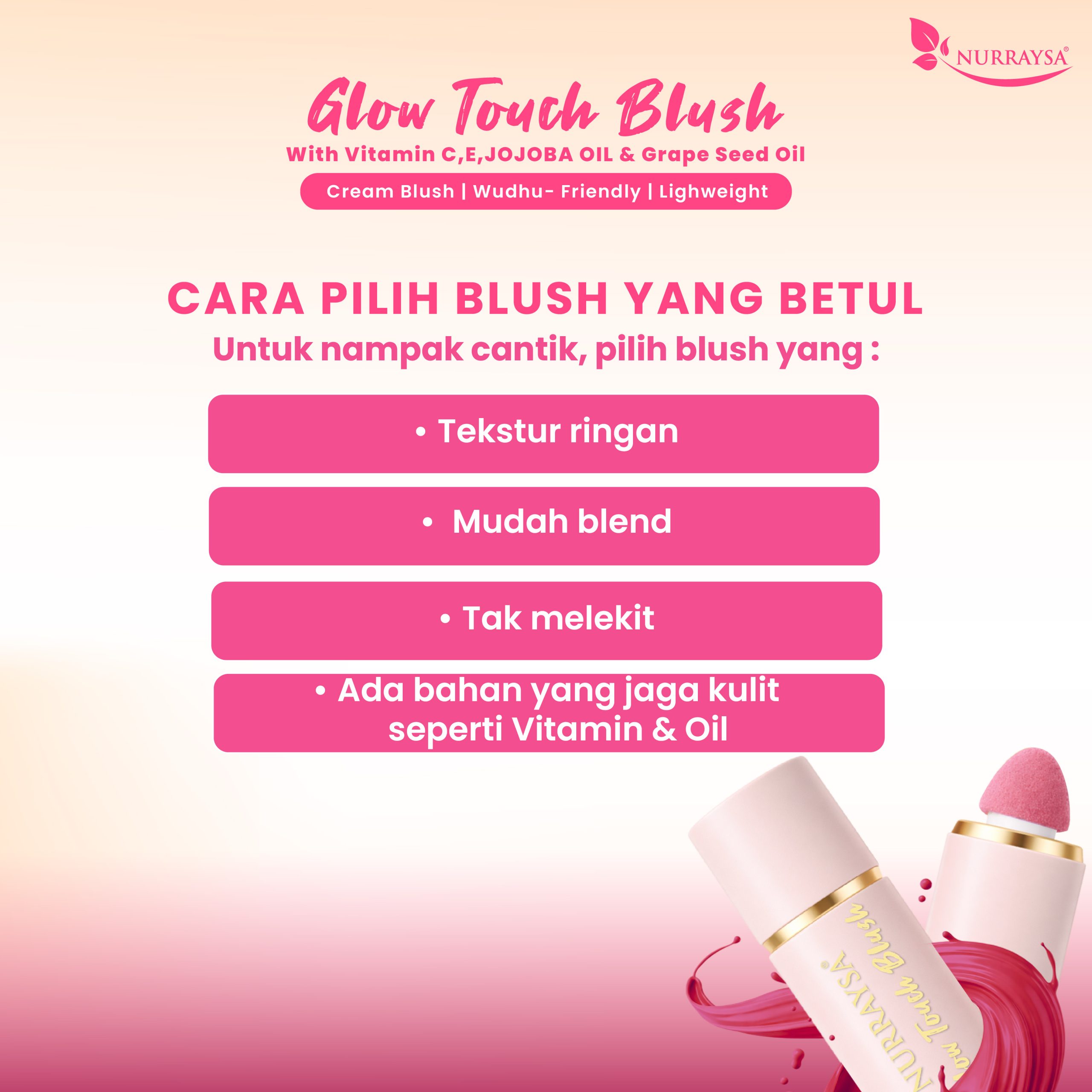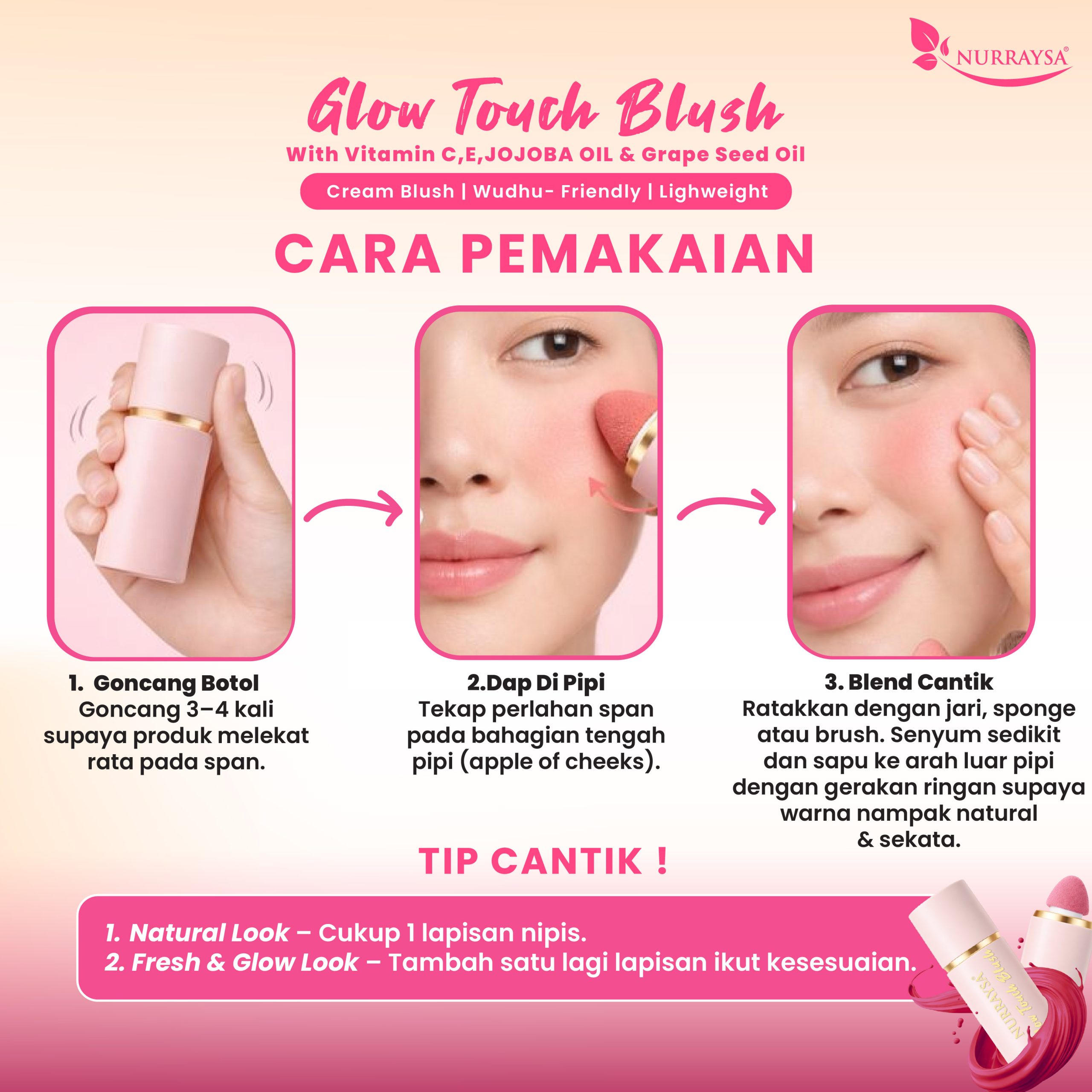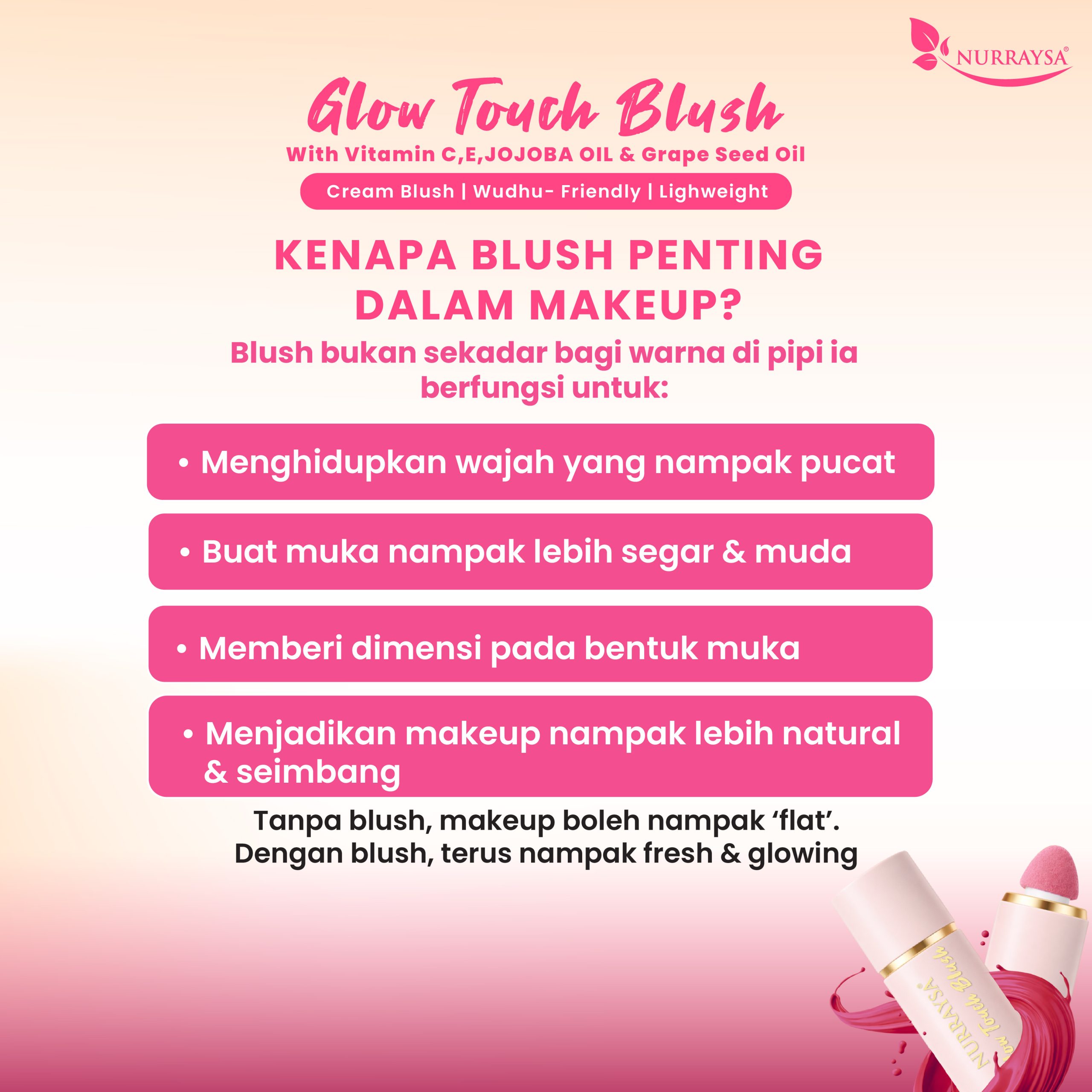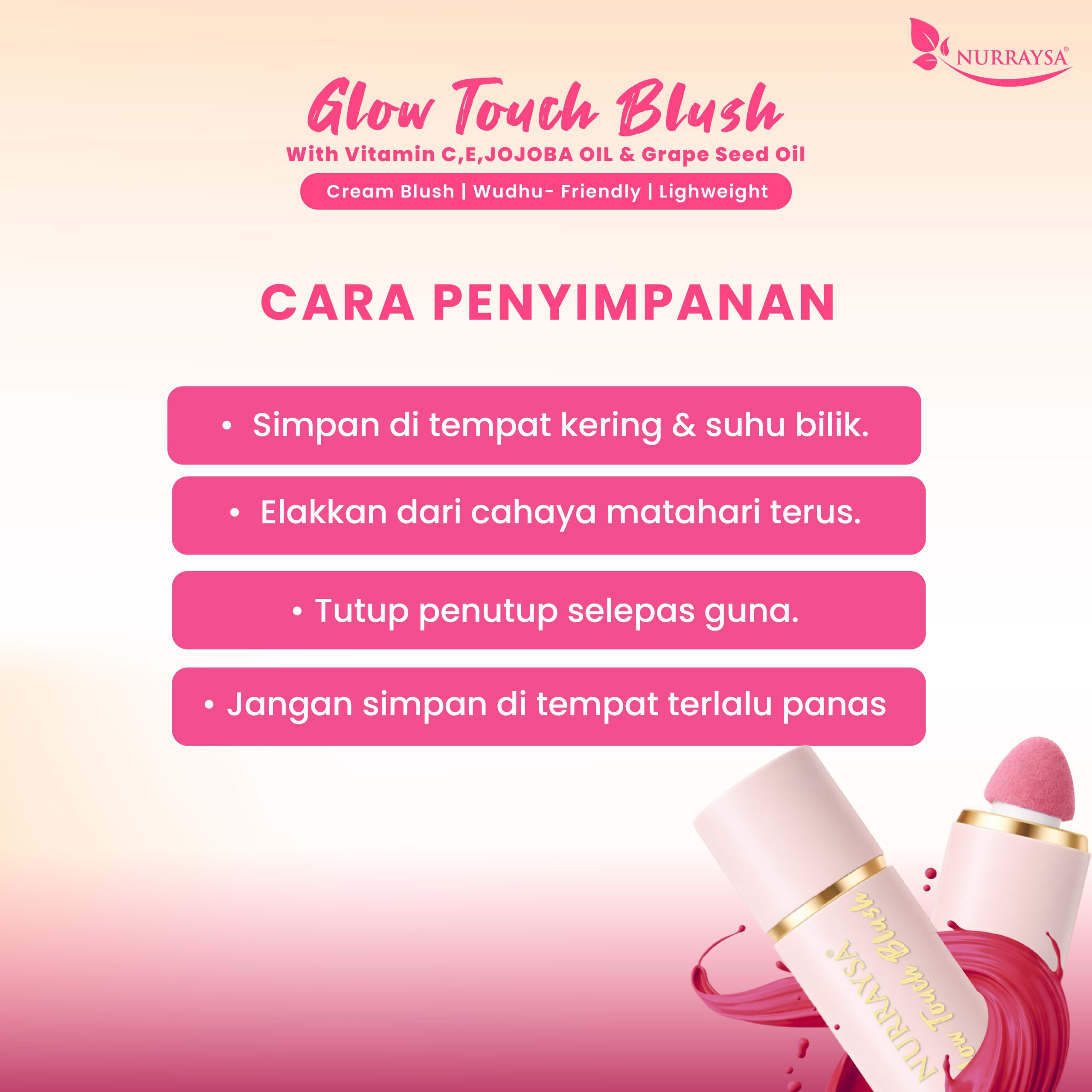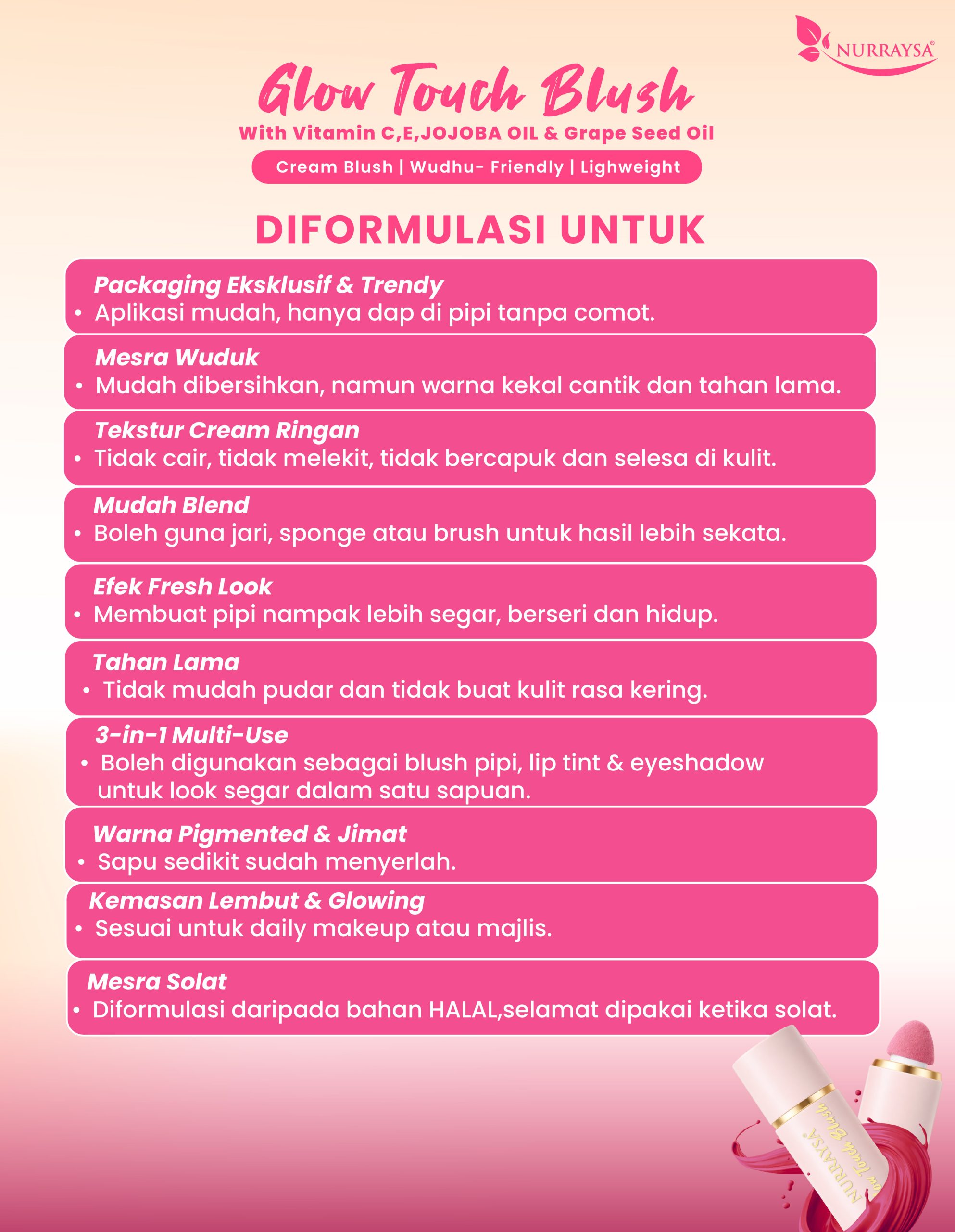 - Glow Touch Blush mempunyai Packaging Eksklusif & Trendy – Aplikasi mudah, hanya dap di pipi tanpa comot.