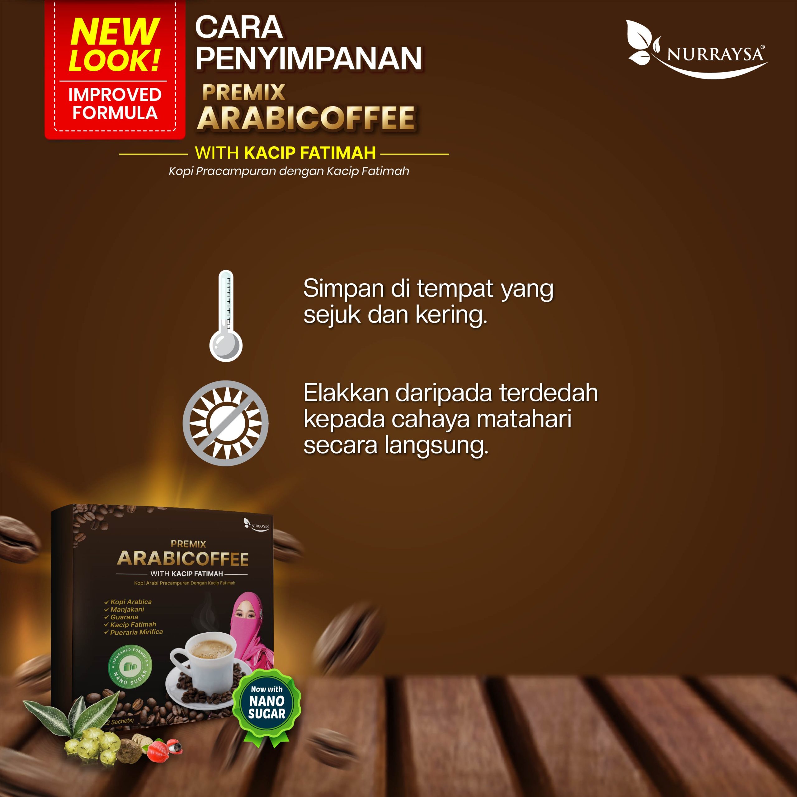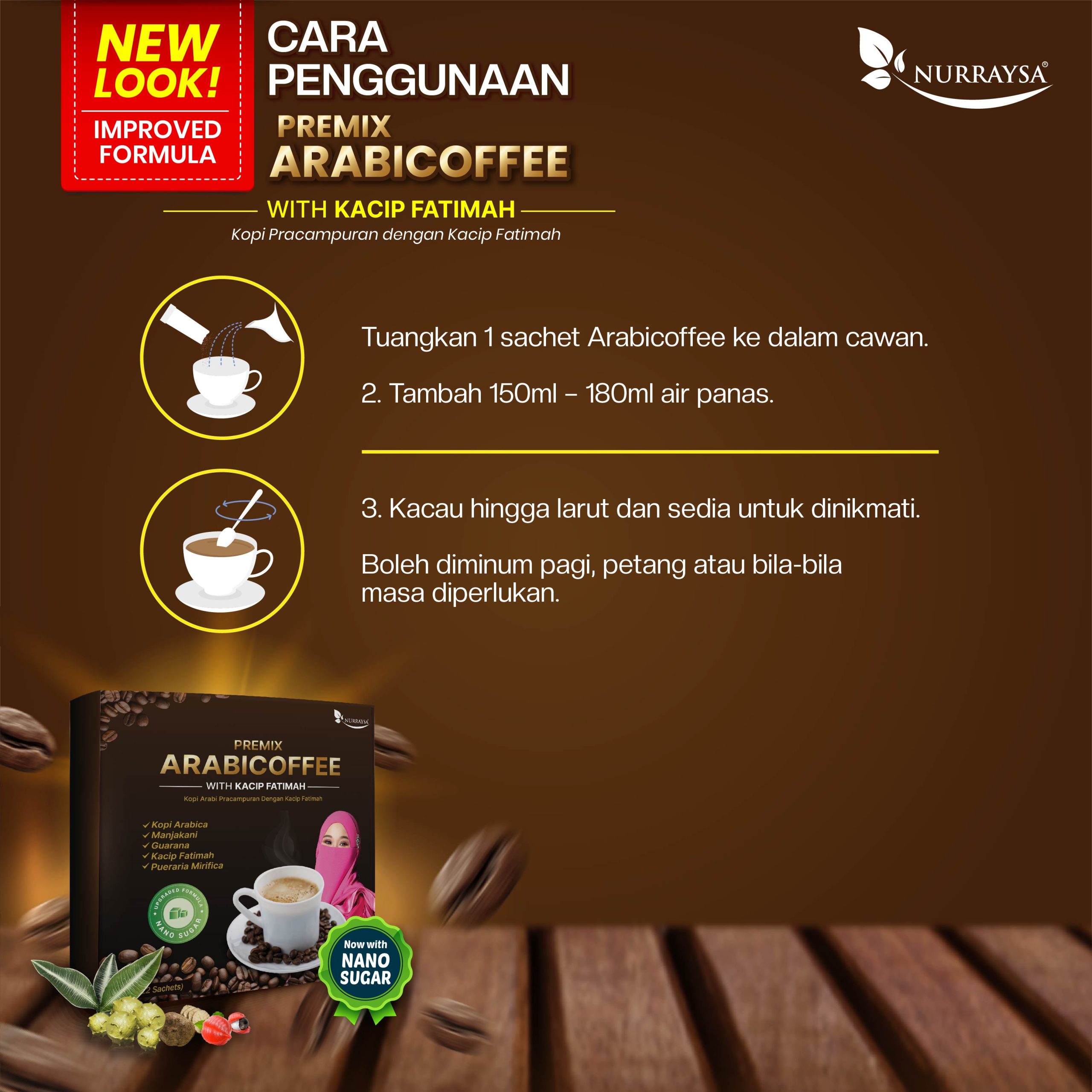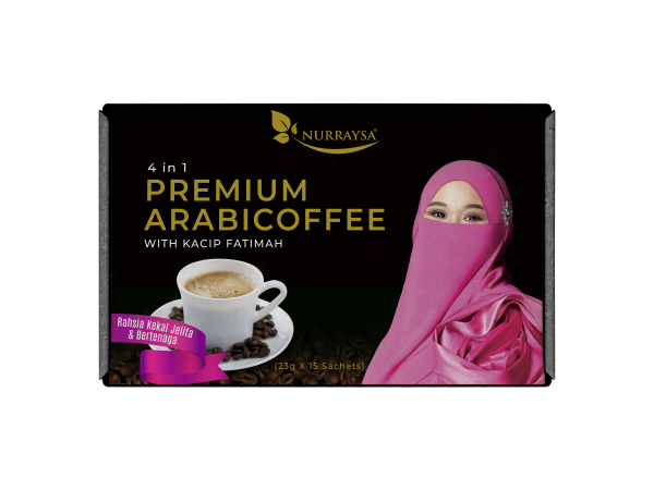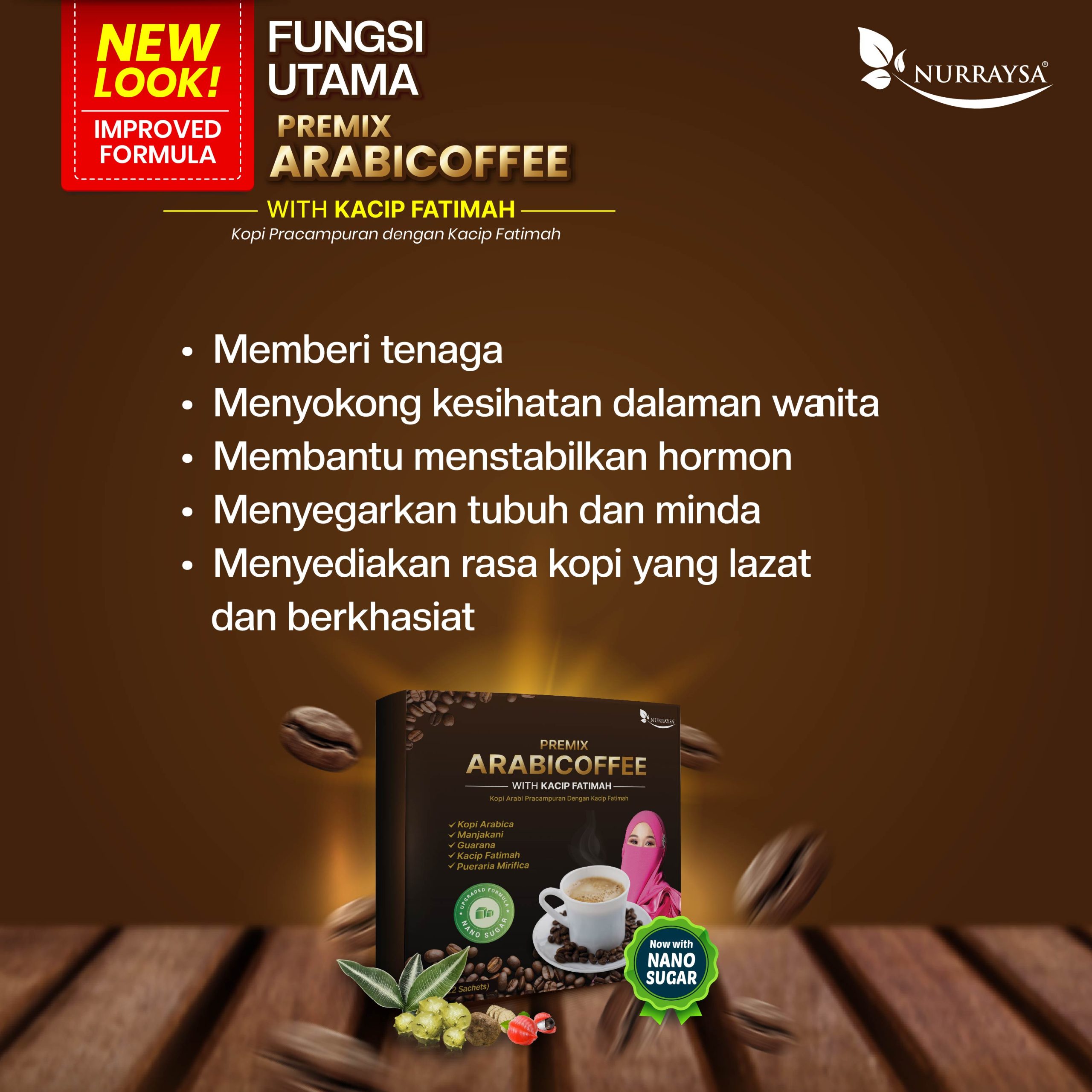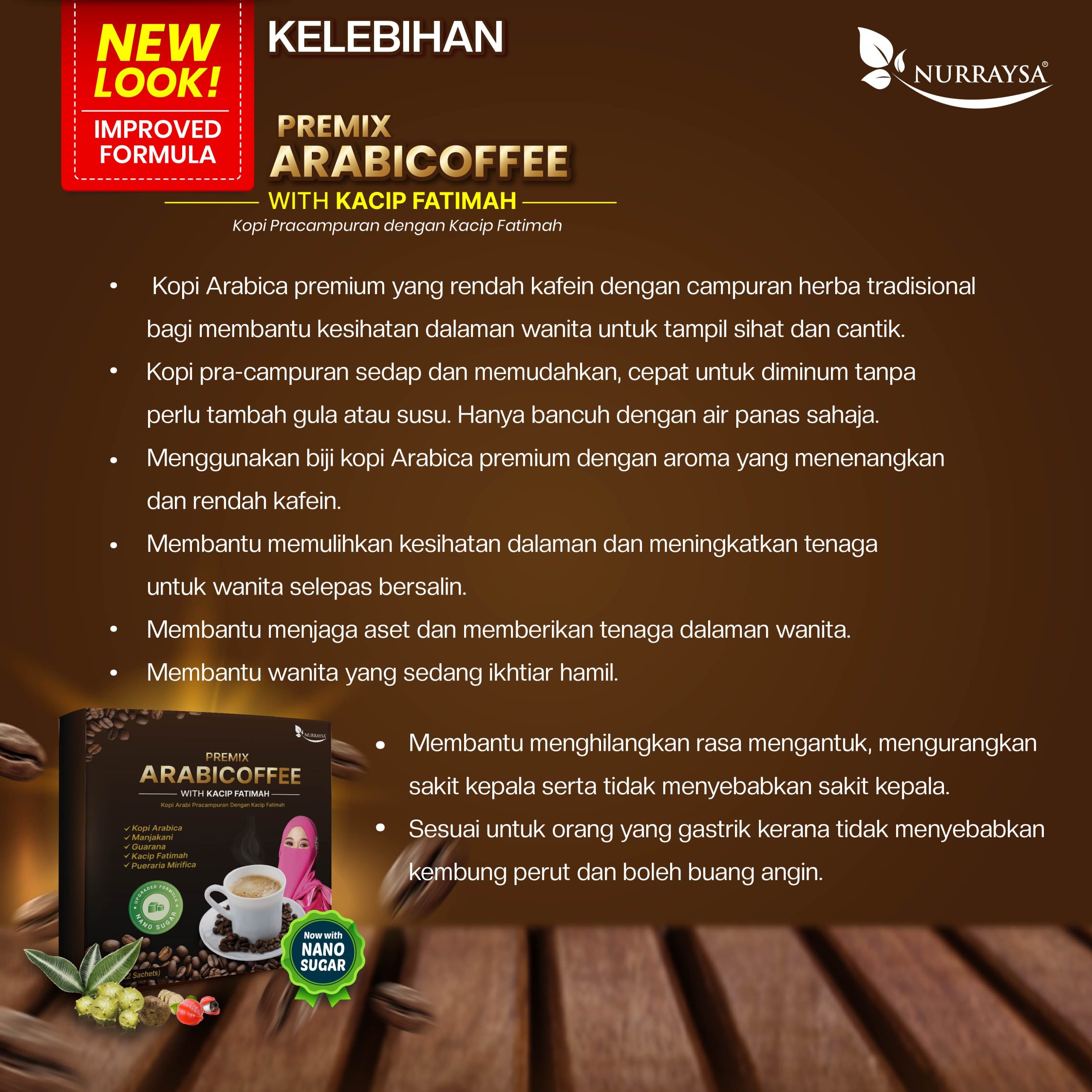 - Premium Arabi Coffee with Kacip Fatimah bagus untuk kecantikan dalaman wanita dengan EKSTRAK MANJAKANI, KACIP FATIMAH,Pueraria Mirifica & GUARANA.