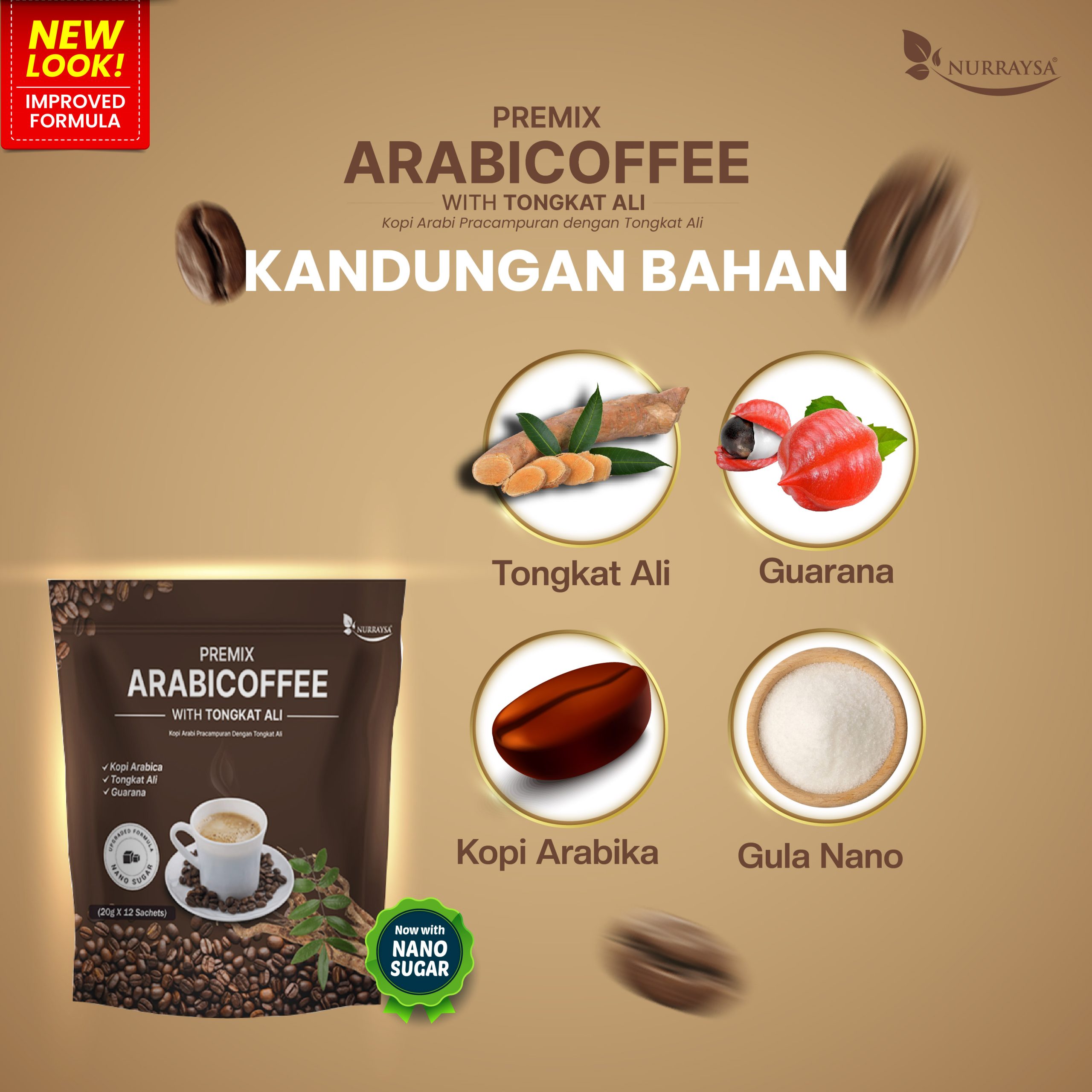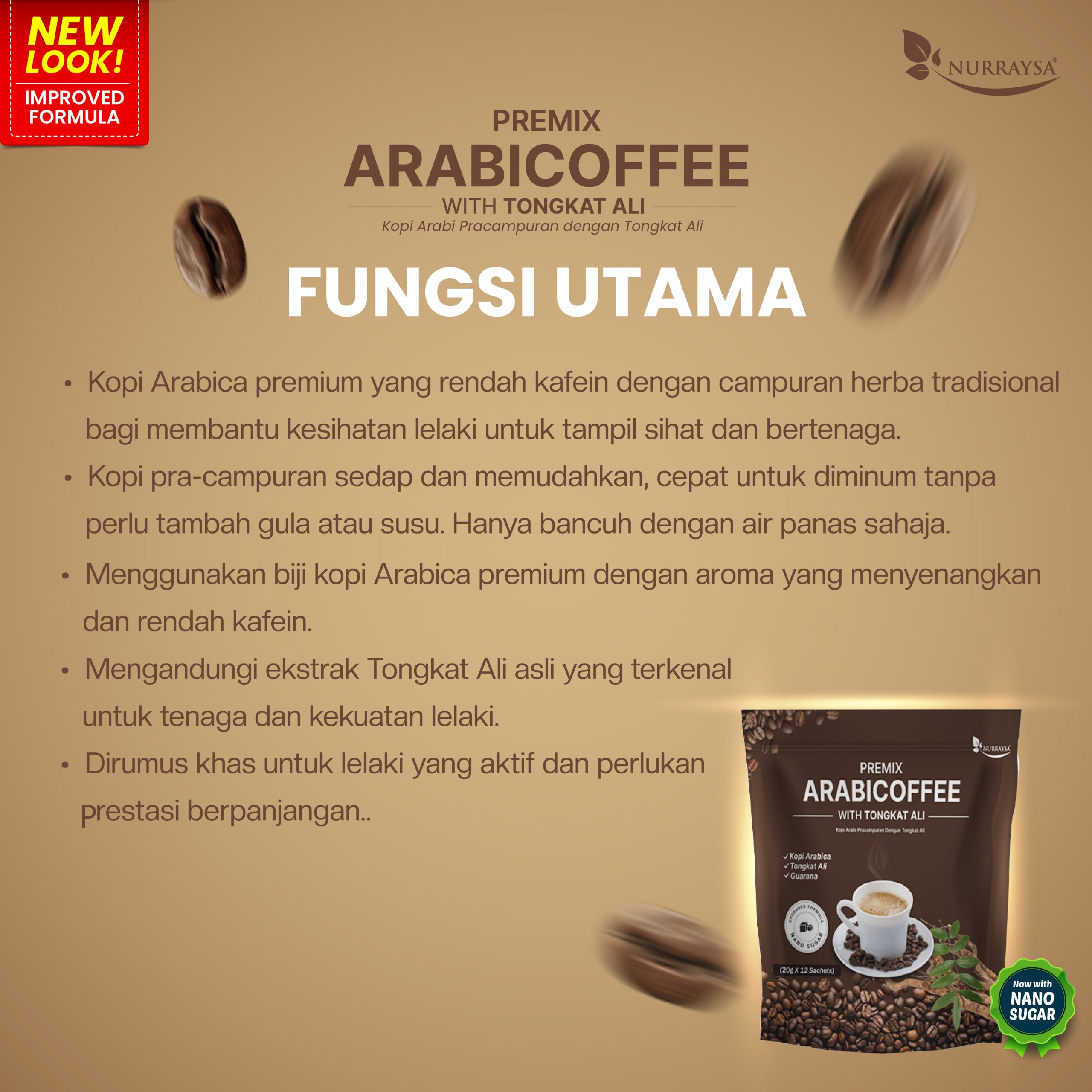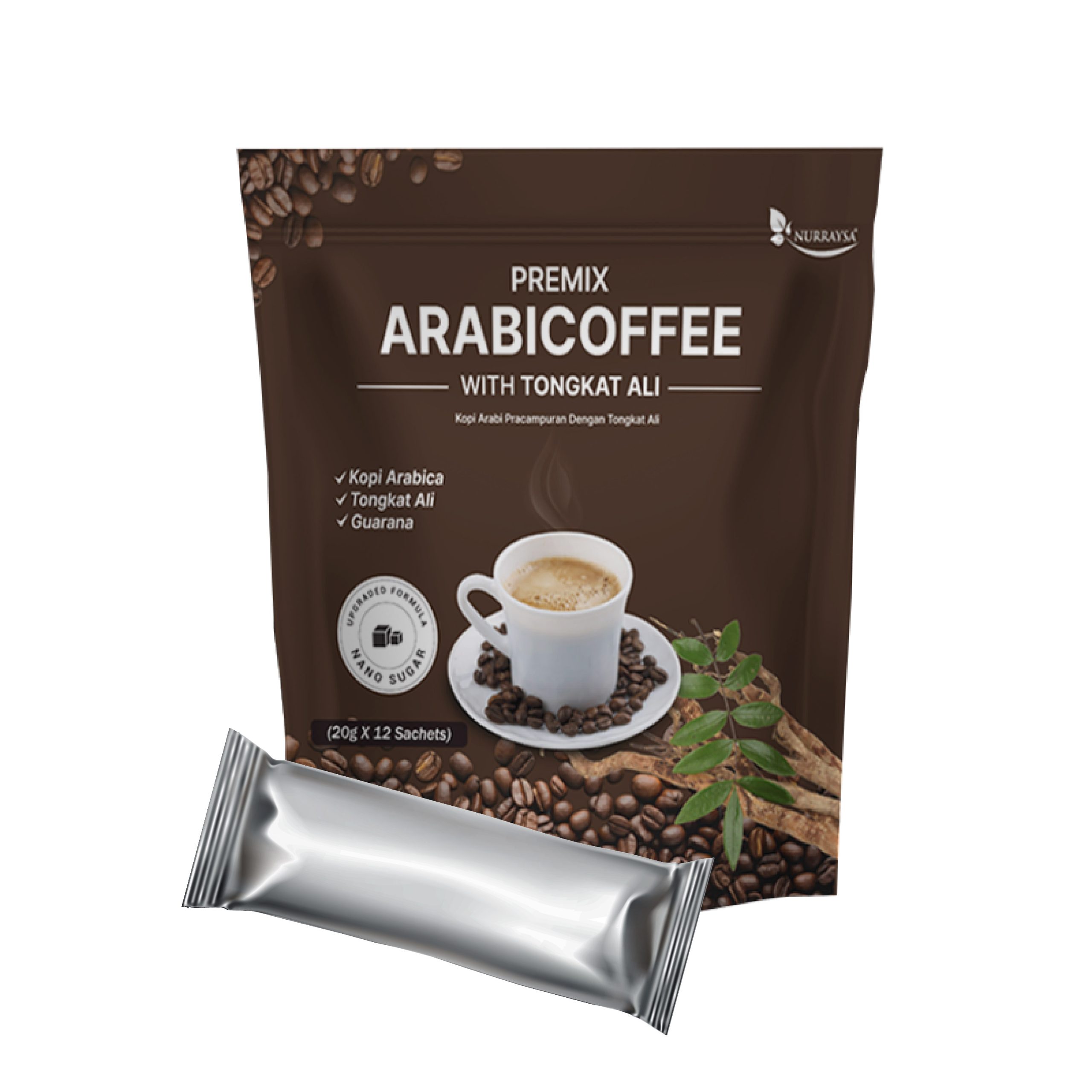 Kandungan : Kopi Arabica, Tongkat Ali, Guarana, Gula Nano