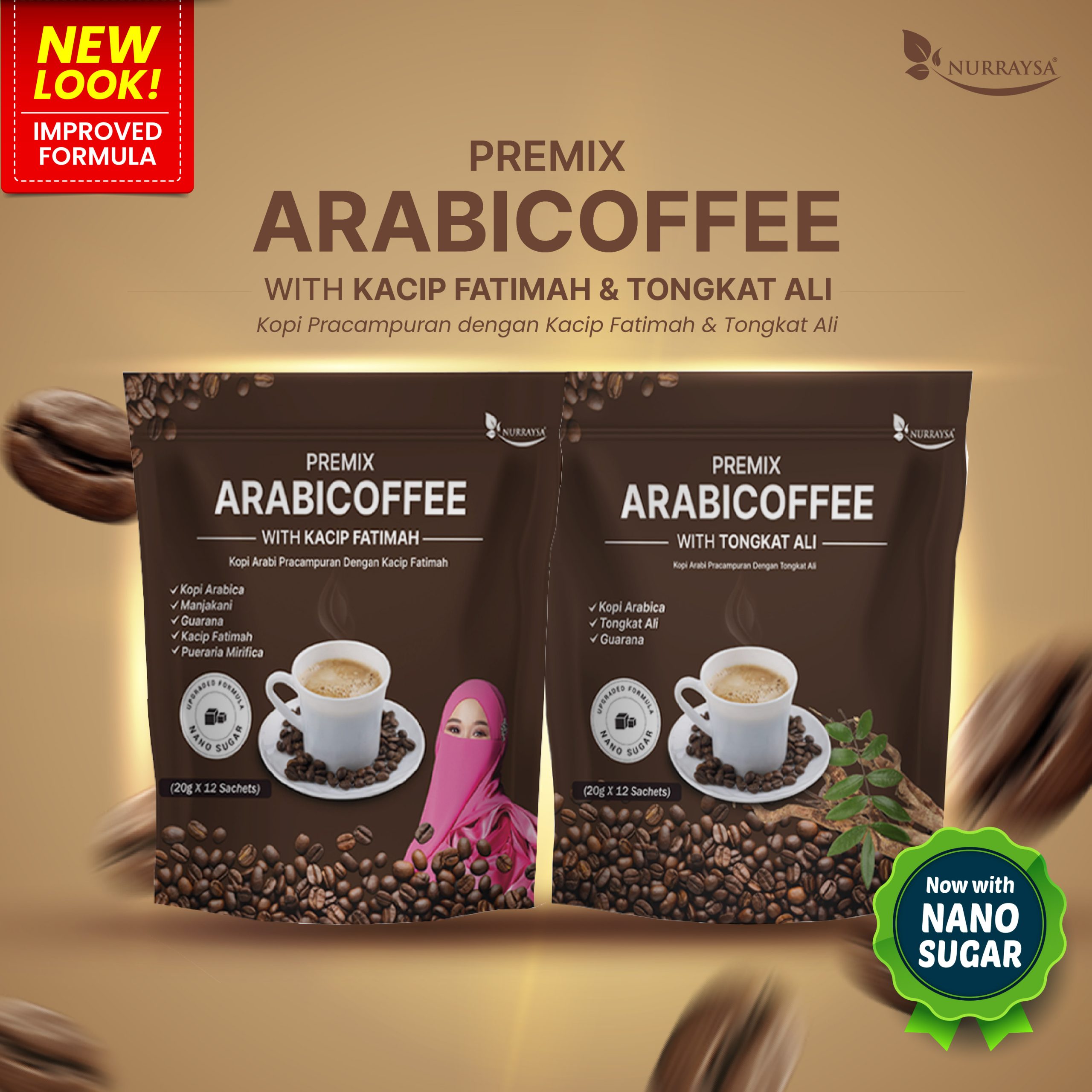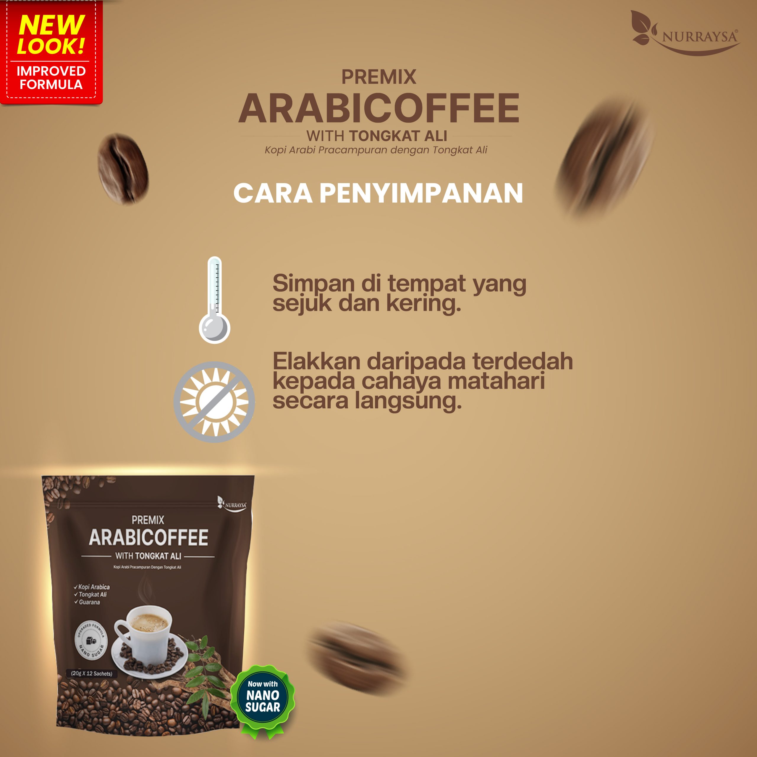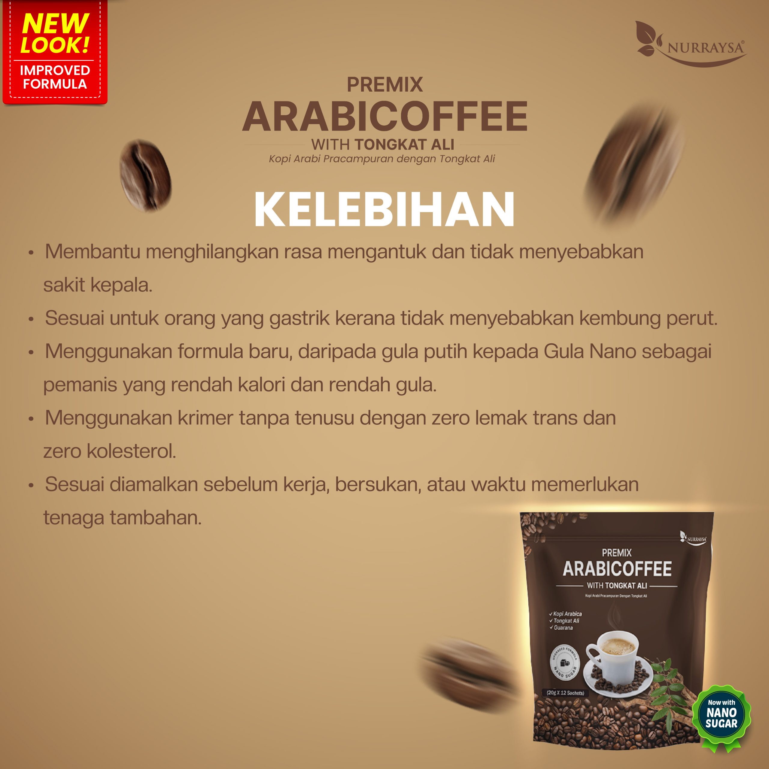 Kandungan : Kopi Arabica, Tongkat Ali, Guarana, Gula Nano